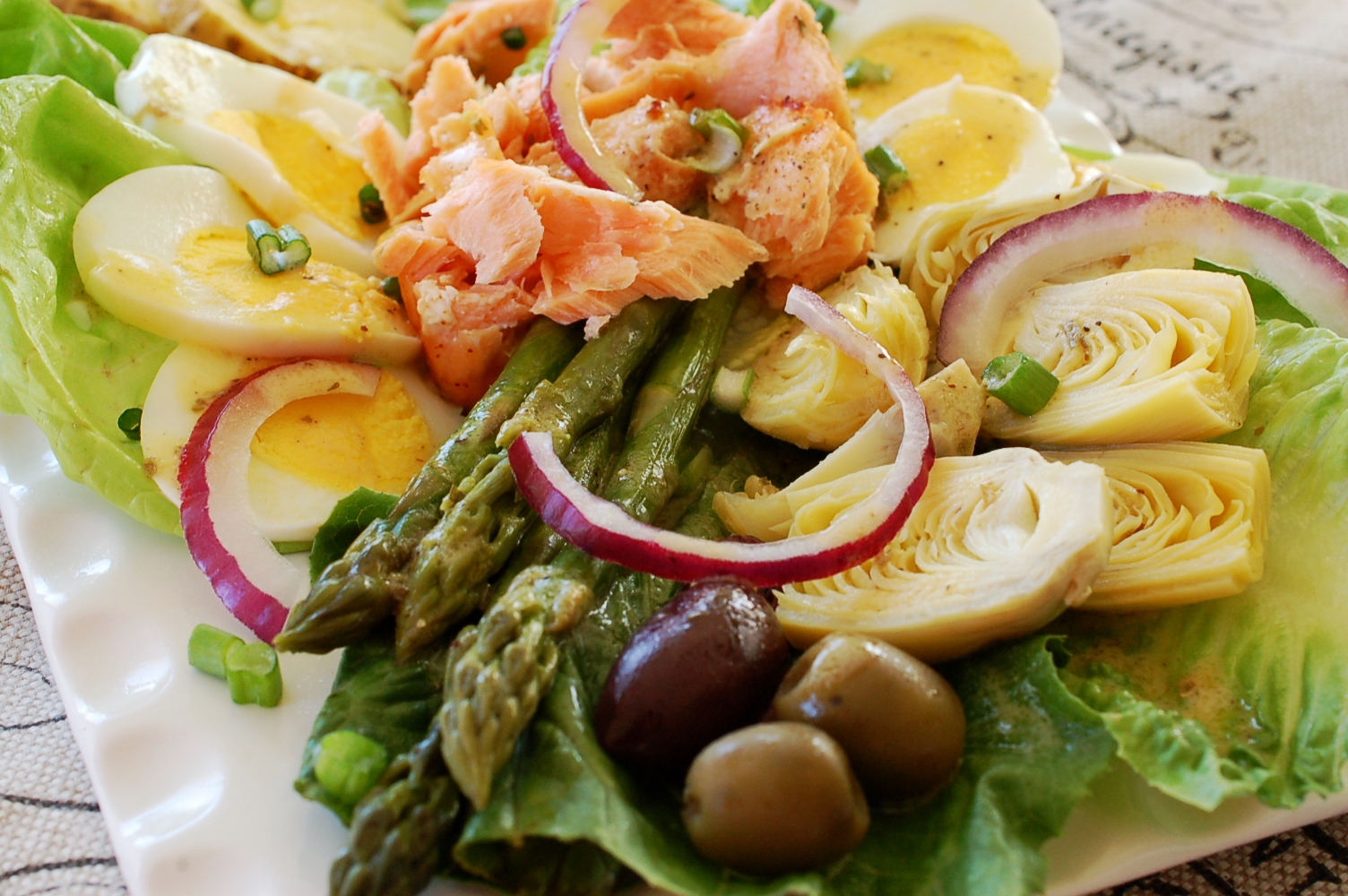 Our take on this classic salad uses salmon, leftover asparagus, eggs, olives, canned artichokes, red onion for color, etc. (pretty much whatever we had on hand at the time).
