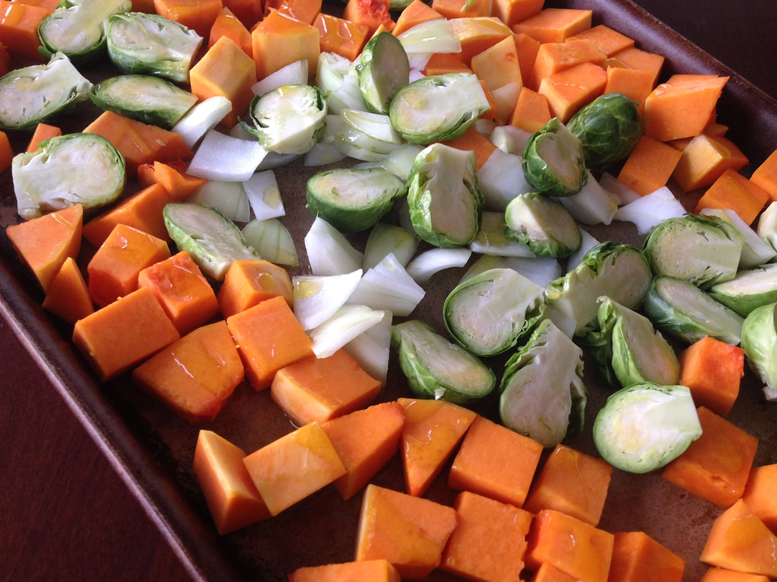 Wash the squash, Brussels sprouts, and Pomegranate (check out our cooking tip on how to remove Pomegranate seeds easily). Chop the onion coarsely into 1-inch chunks, the Brussels sprouts into half, and the butternut squash into cubes. Place them in a large jelly roll (may need two) or baking pan. Generously drizzle with oil and mix with your hands to coat evenly.