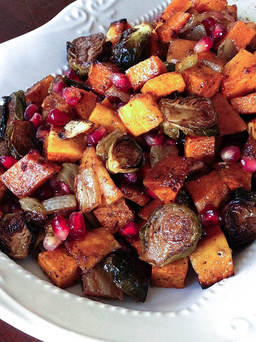 Roast vegetables at 350 degrees for about 30 minutes, or until Brussels sprouts have a golden color (You do not want the Brussels sprouts to be mushy). Test them with a fork. For the last 5 minutes of cooking, add pomegranate seeds.