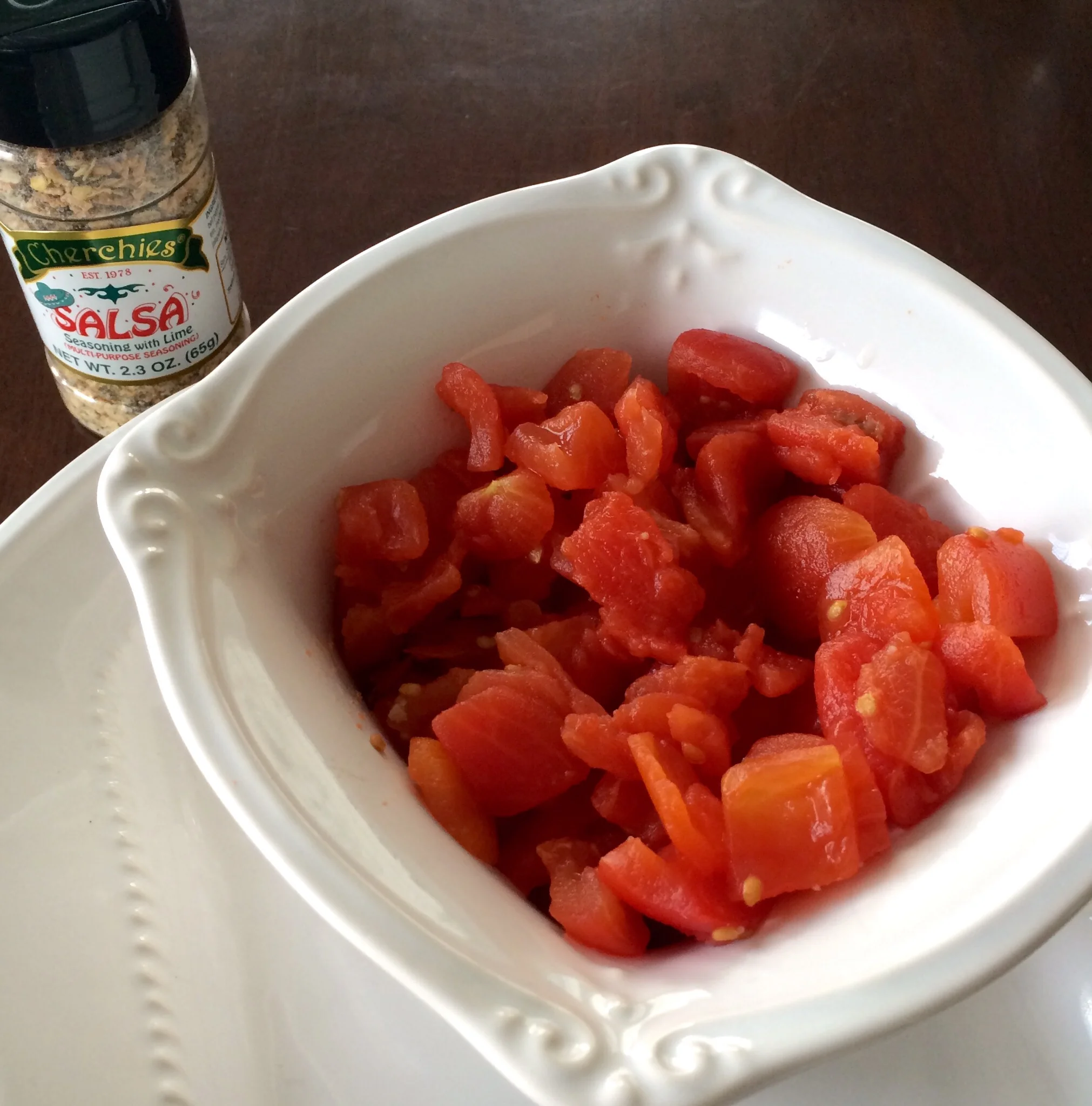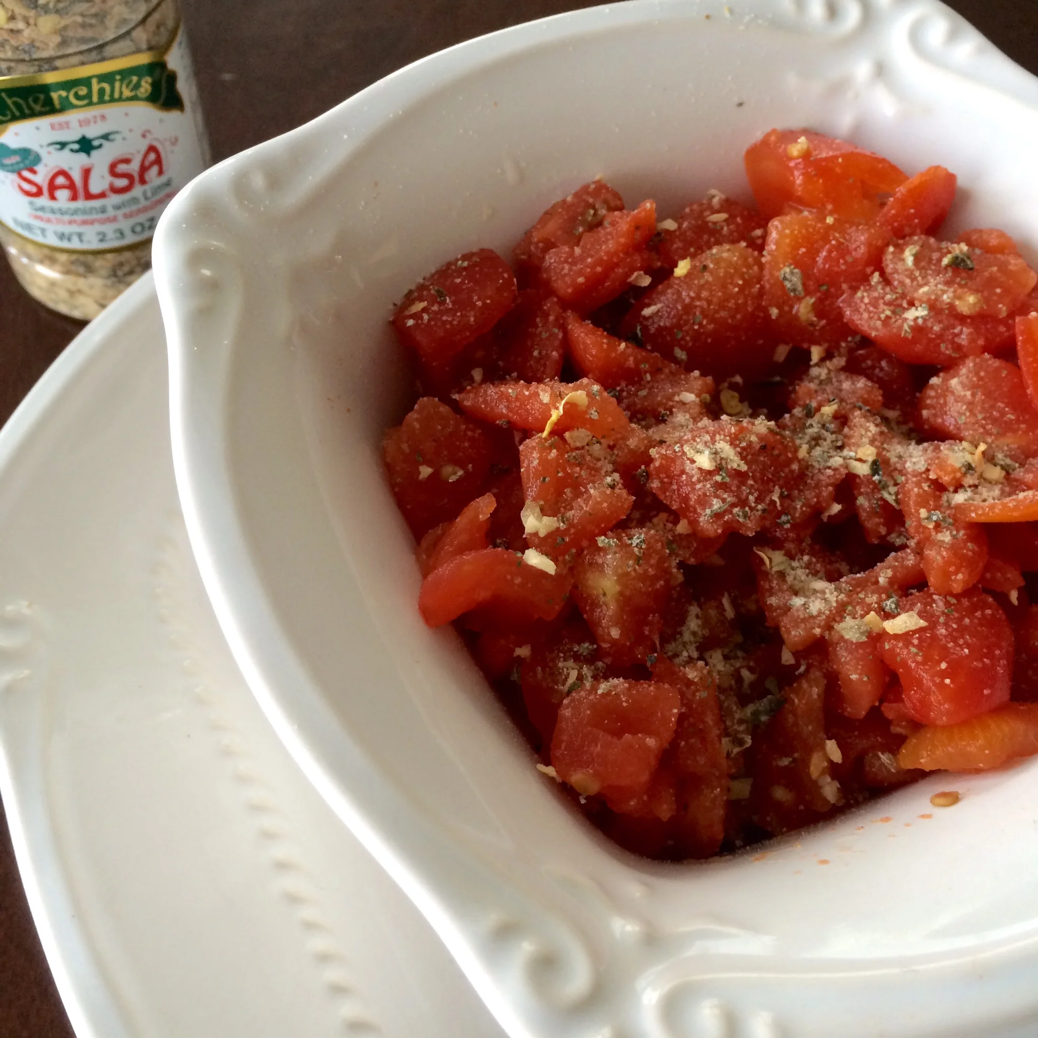 Company coming and no salsa?  No problem…Cherchies Salsa seasoning is here to save the day!   I keep this spice and canned diced tomatoes on hand for those impromptu gatherings.  Fresh tomatoes in season are always best, but here in Pennsylvania in the winter, our options are limited.