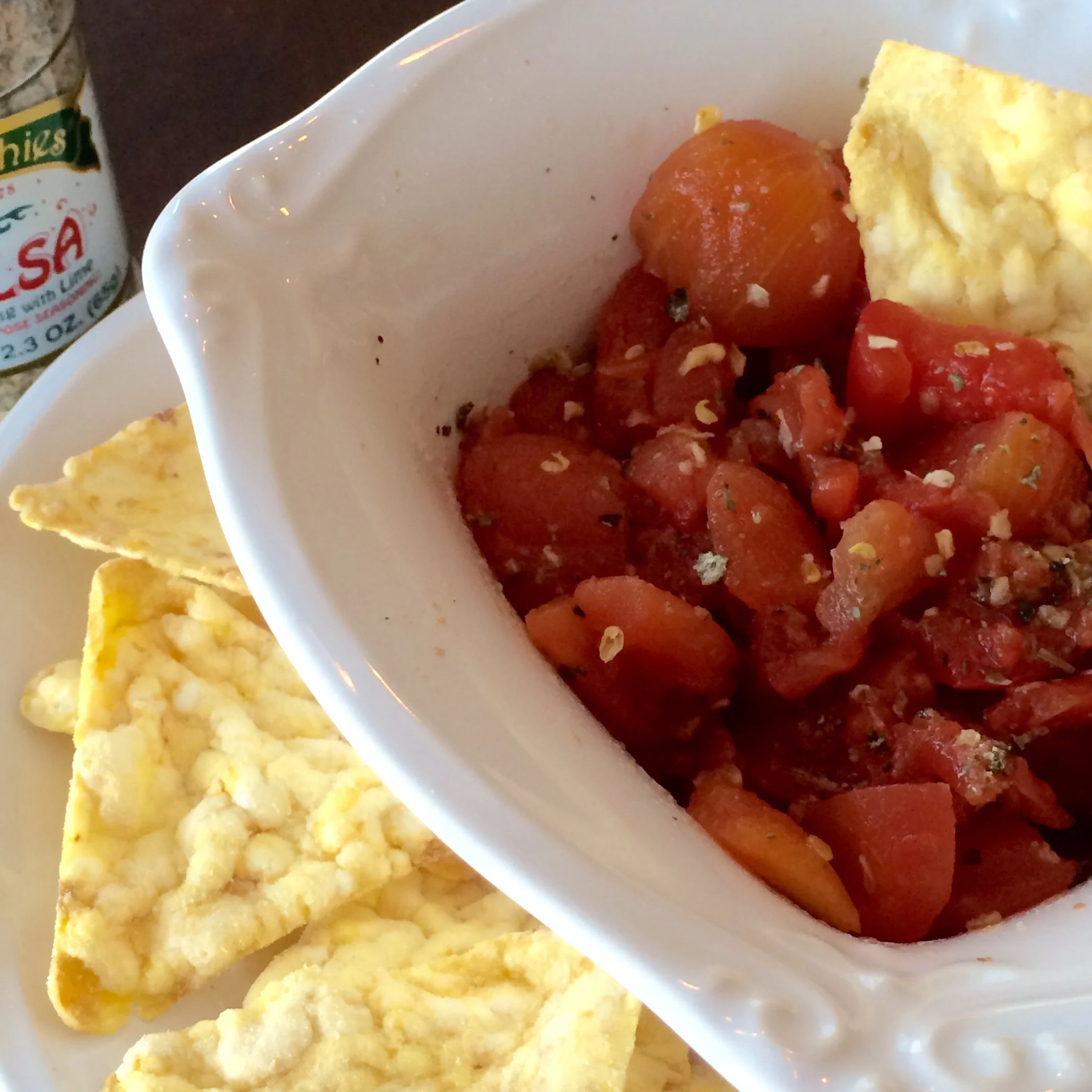 Add your favorite chips, and voila, simple salsa!  Now I’m hungry!!  Enjoy!