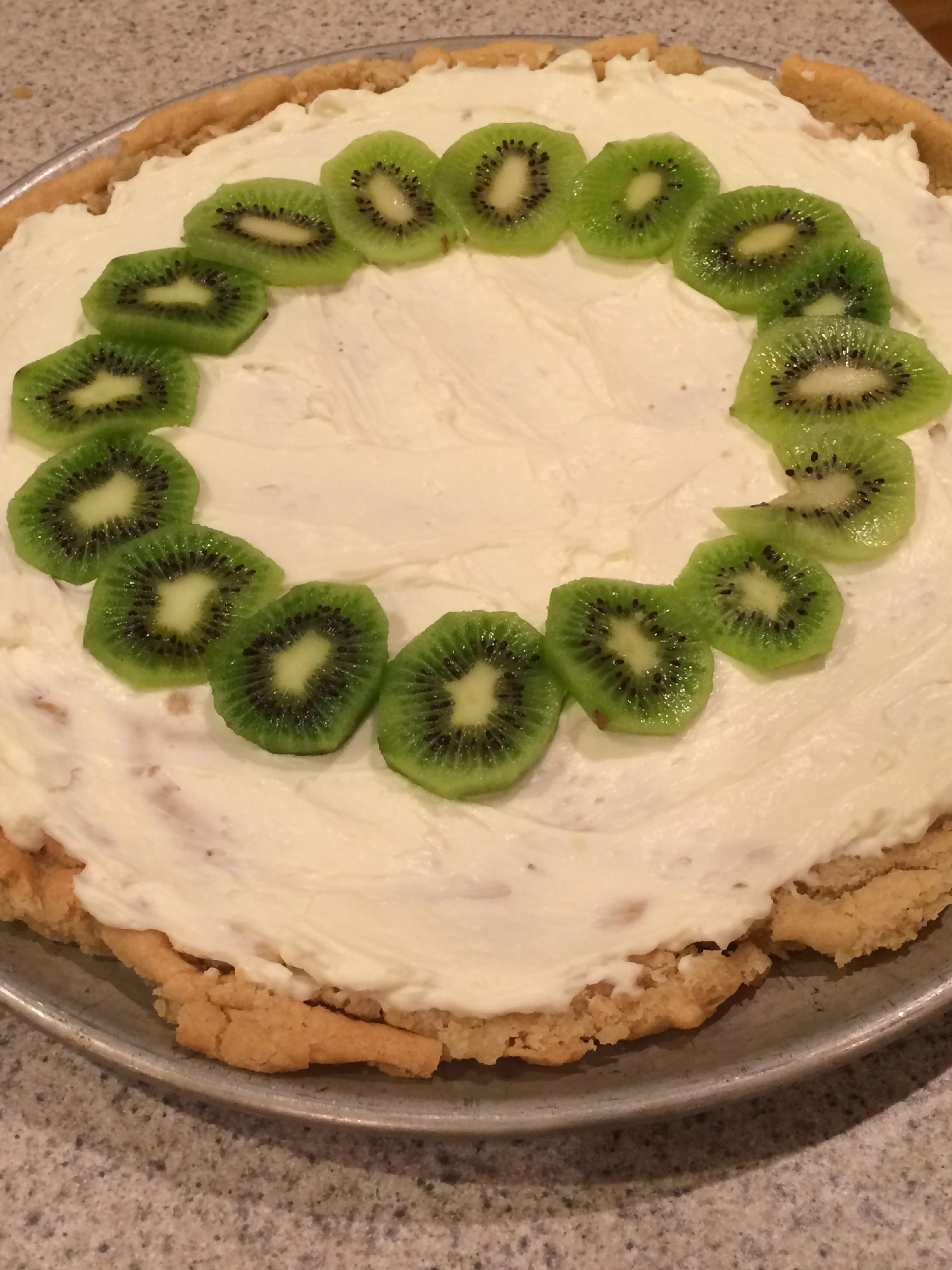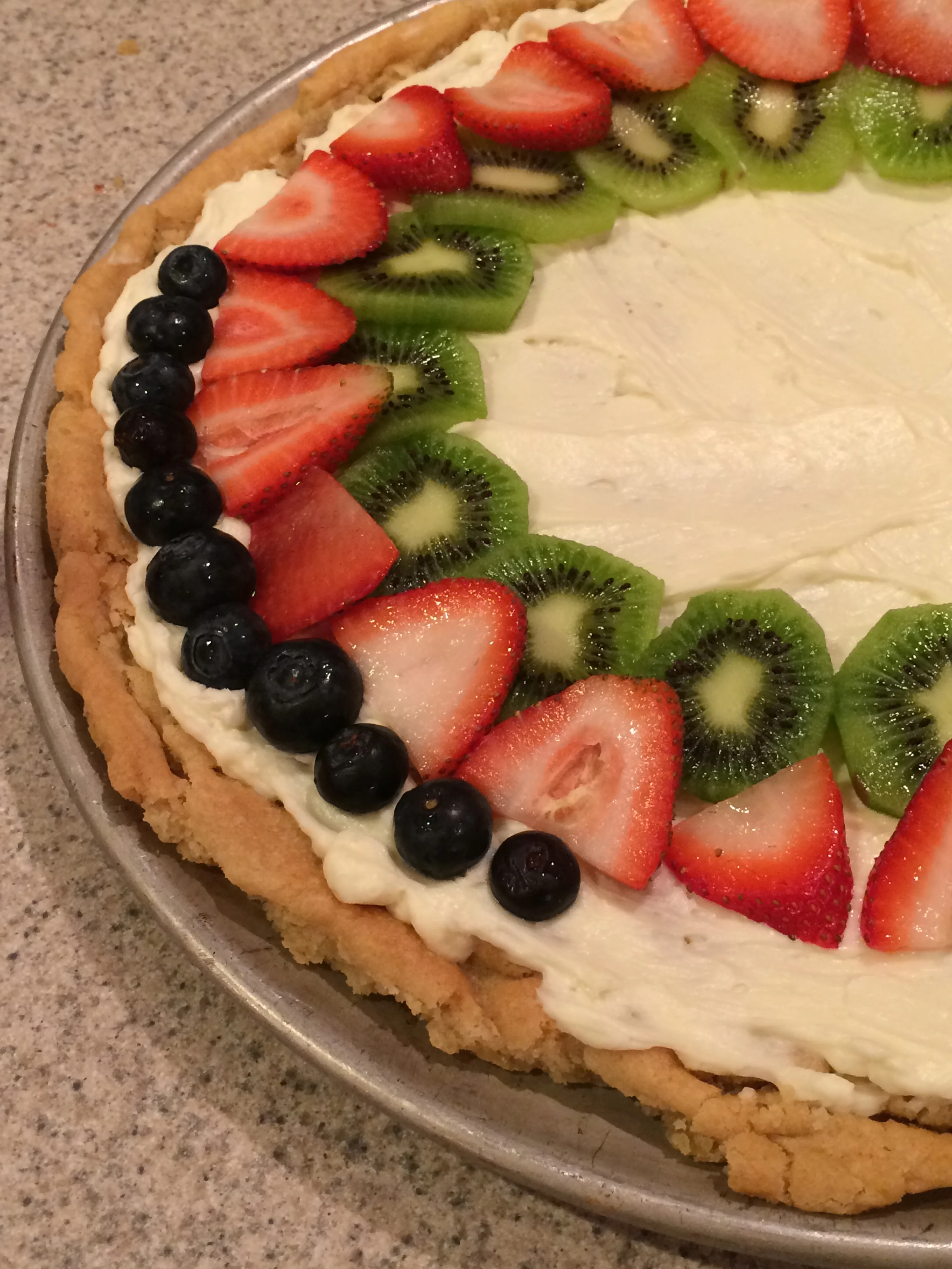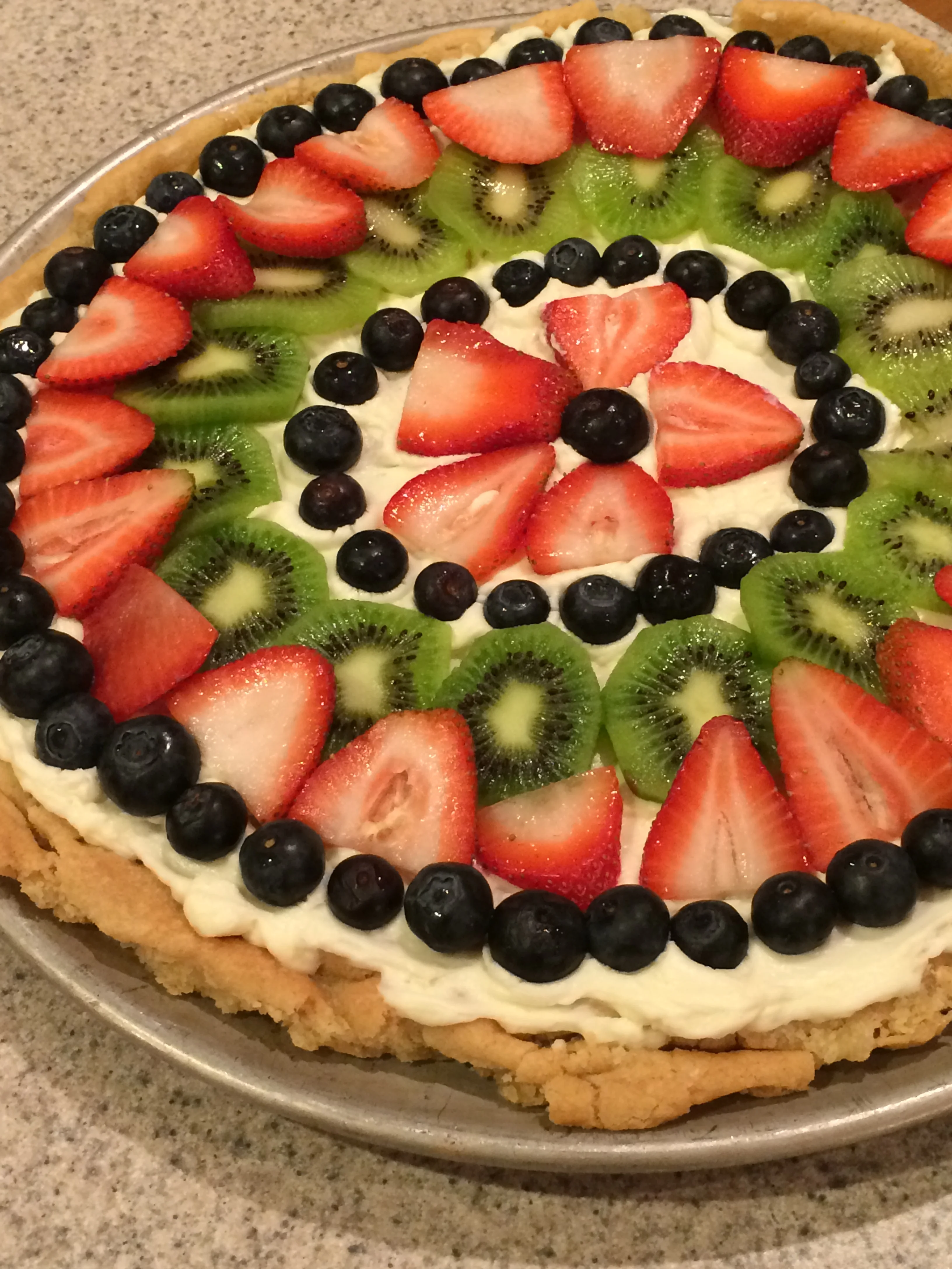 Then load up the pizza with whatever fruit makes you happy. In this case, I used kiwis, strawberries, and blueberries. My mother’s recipe called for mandarin oranges, but for some reason my children don’t like them (silly kids). If I had had Clementine’s on hand, I would have used them.