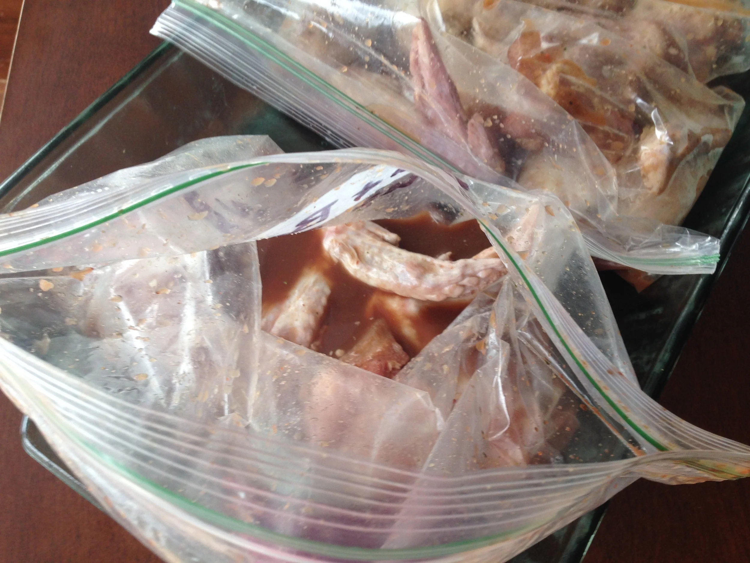 For the marinade, in a recloseable plastic bag, add the following: red wine, soy sauce, Champagne Mustard, Sriracha hot sauce, and balsamic vinegar.  Mix together.  Add the chicken to the bag and marinate in the refrigerator for at least 6 hours (overnight...even better).