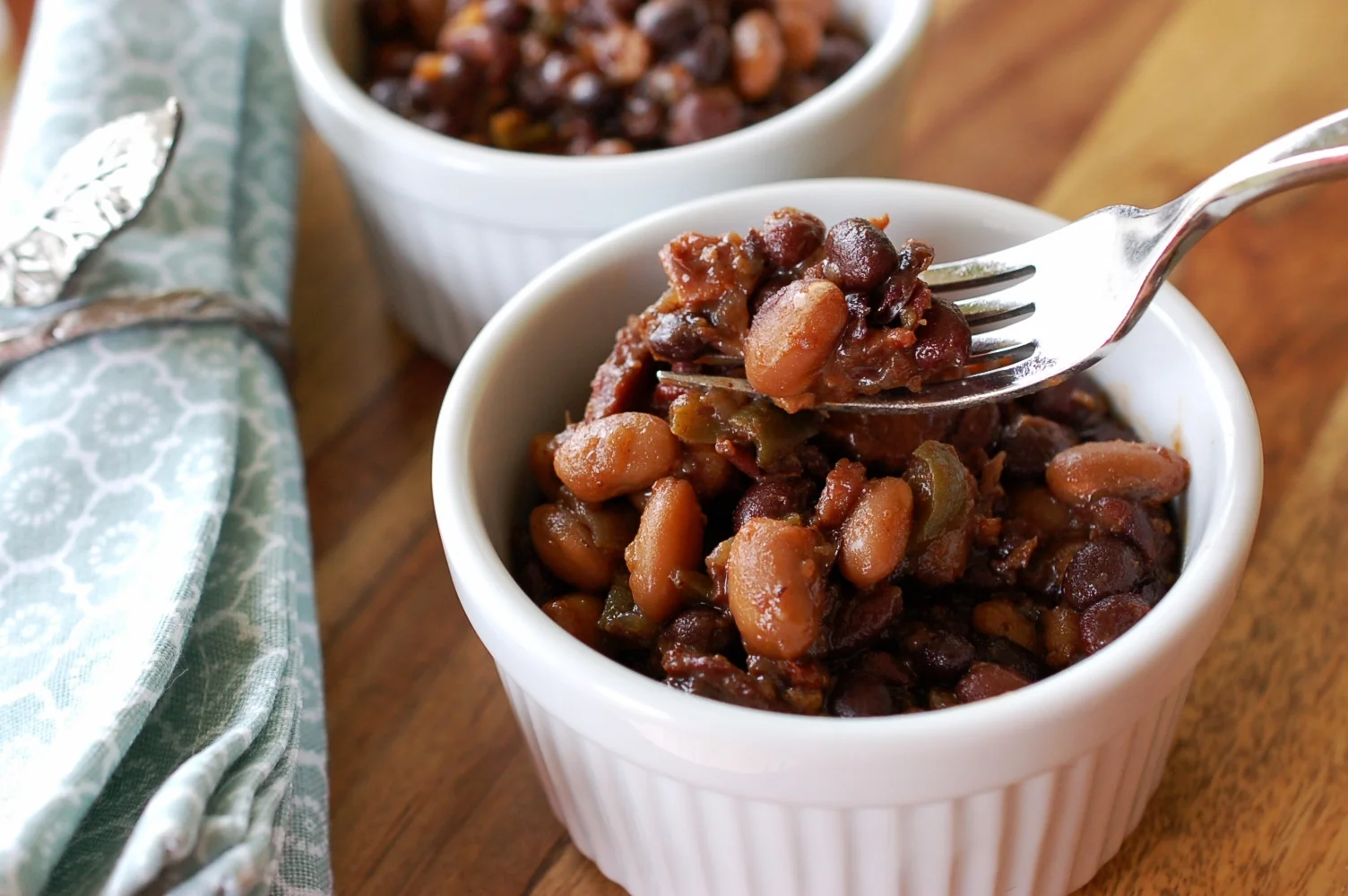 In a large skillet, cook bacon over medium high heat until crispy. Remove bacon and add chopped onion and bell pepper to hot bacon grease. Saute for 5 - 7 minutes until softened. Add beans and jam.