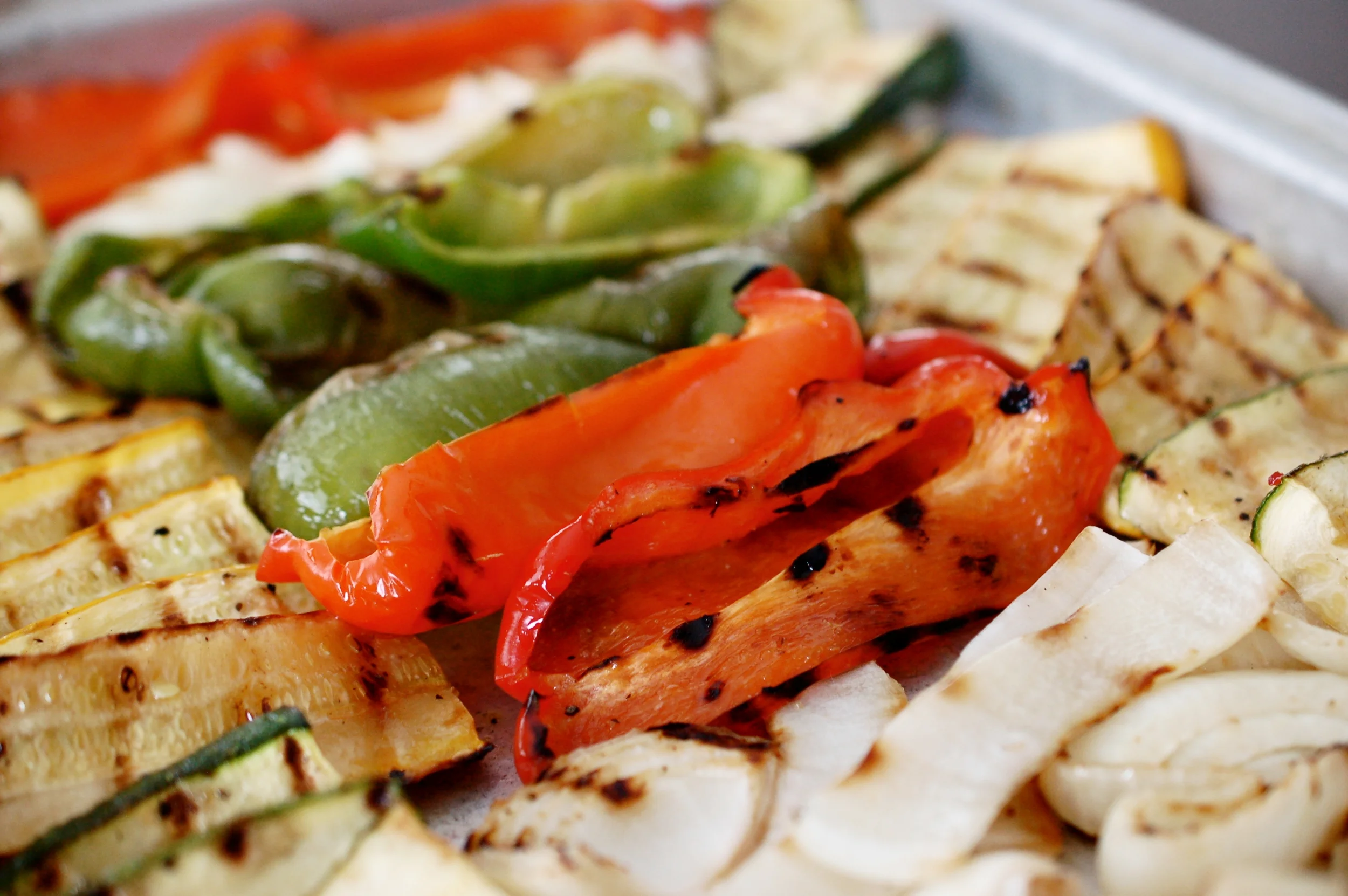 For this recipe, we used red and green peppers, zucchini, yellow squash, Portabella mushrooms, and vidalia onions, but feel free to substitute your favorite veggies (eggplant, yams, asparagus, etc.)