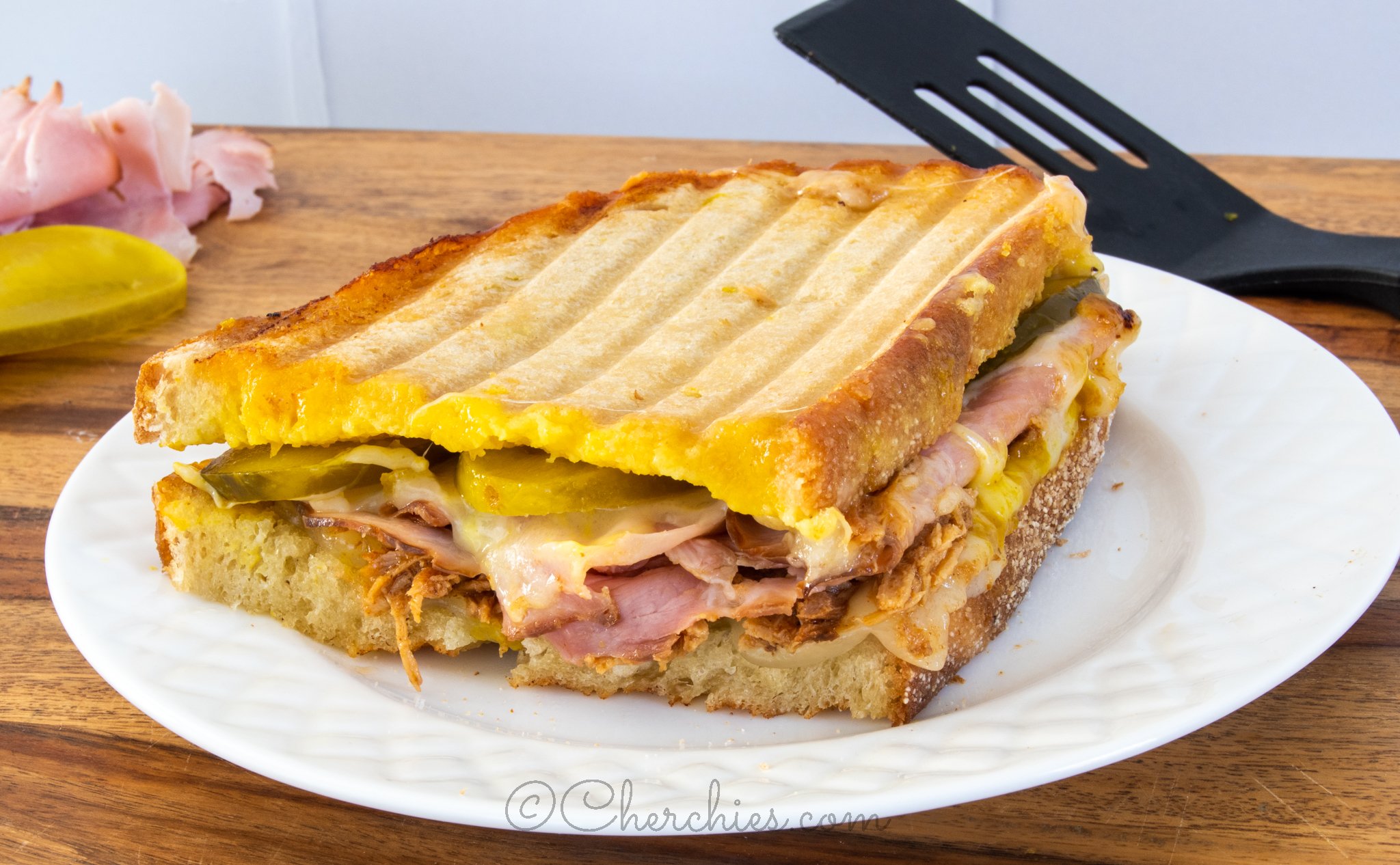 We swapped traditional yellow mustard for Cherchies® Award-Winning Hot Banana Pepper Mustard or Cherchies® Champagne Mustard for an extra flavor kick. And instead of classic Cuban bread, we used sliced sourdough, then grilled the sandwiches in a panini press until golden and irresistible.