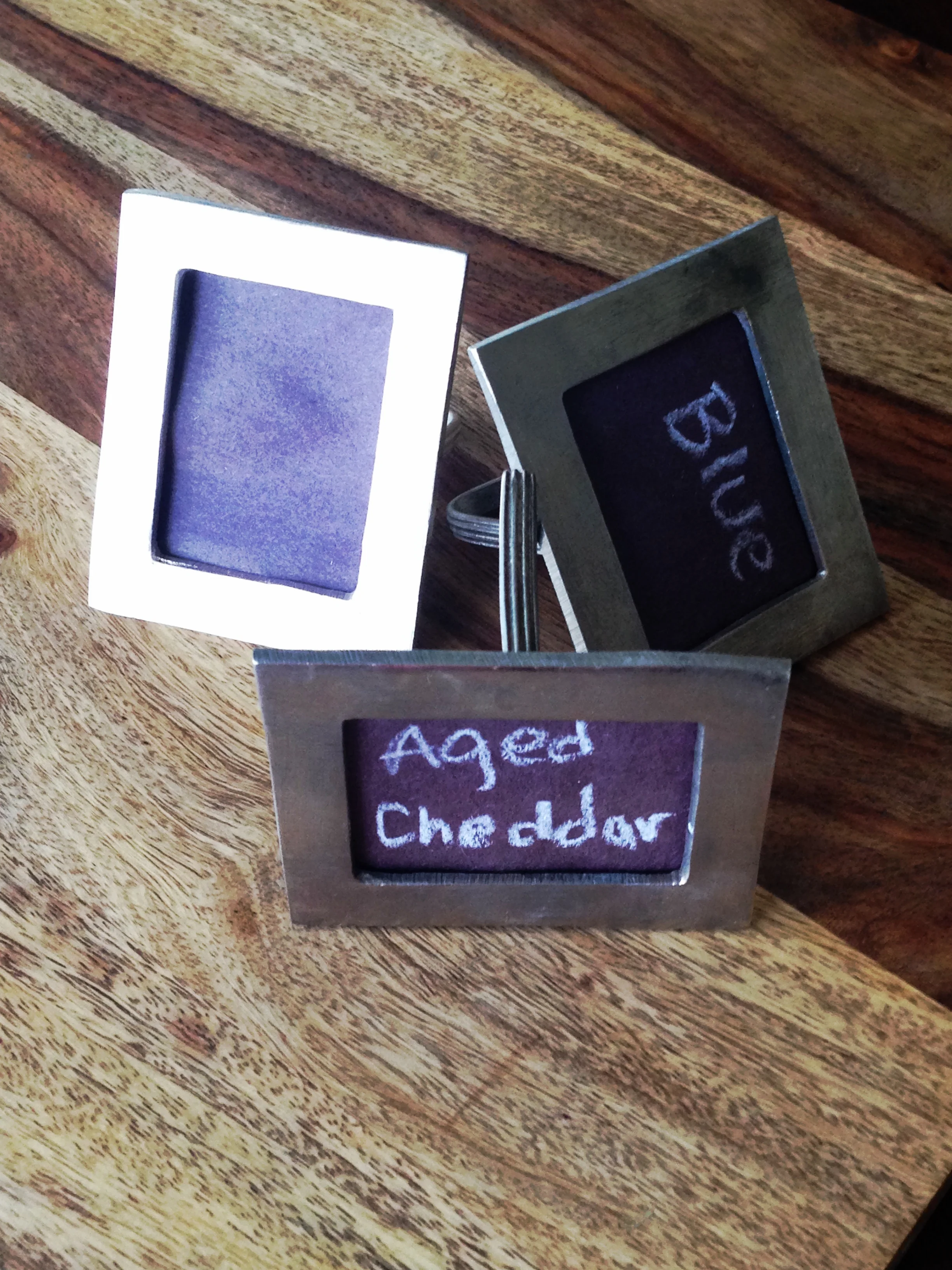 Chalkboard anything is all the rage for labeling, and the possibilities are endless. Here, we used picture frame napkins rings (you could substitute mini picture frames) that we had lying around, and then added black construction paper to the frames to create "faux" chalkboards.